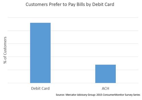 As shown in the image below, consumers also prefer 3:1 to pay with debit cards rather than the ACH method, which requires more information to submit and thus more time to pay. Offering debit card payments makes it easier for customers to pay since 80 percent of customers do not carry their checkbooks for making ACH payments.1