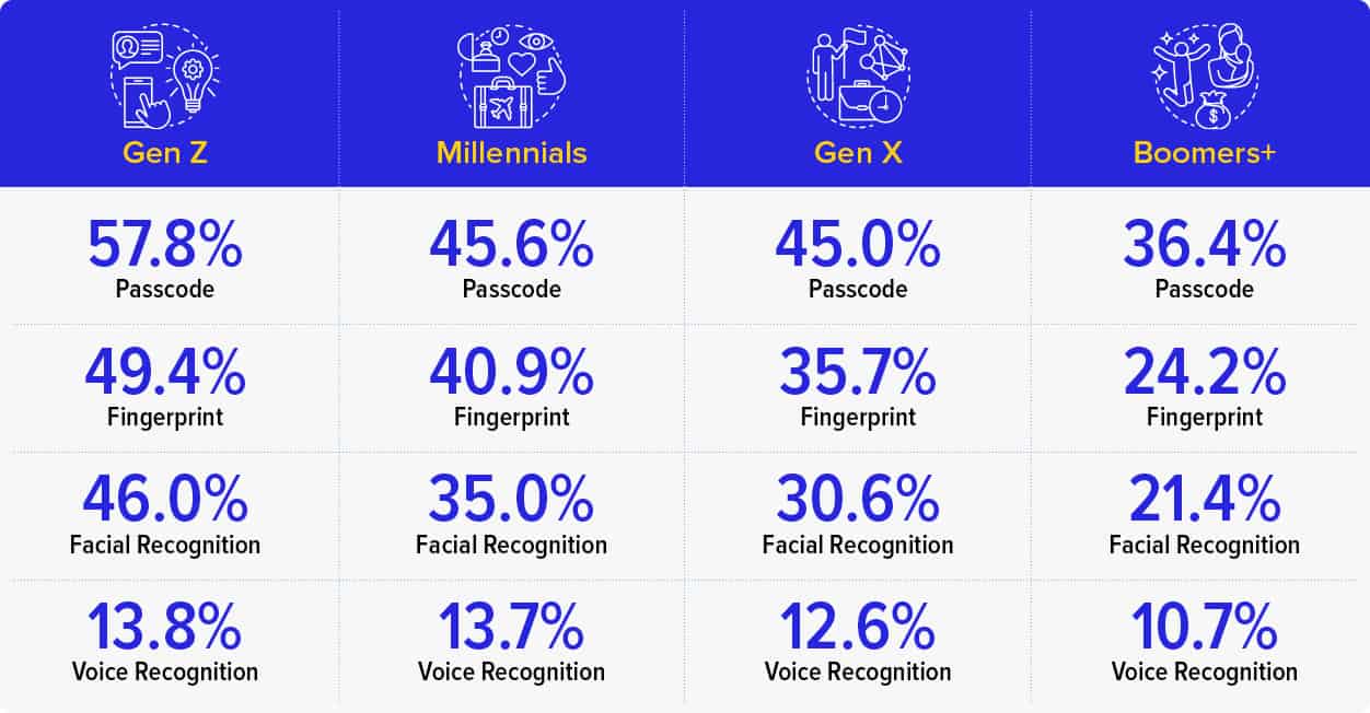 As Figure 1 shows, large segments of Gen Z and Millennials report that standard smartphone security features such as passcodes, fingerprints and facial recognition authentication would make them feel more secure in utilizing mobile and digital platforms.