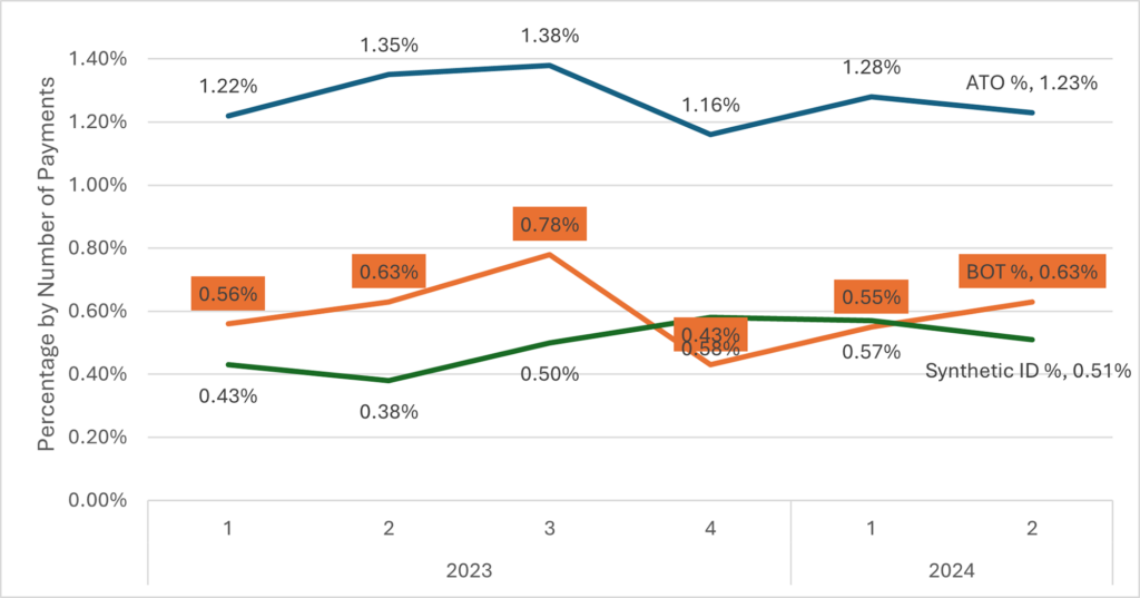 In the third quarter of 2023, fraudsters used bot attacks and Account Takeover attempts to validate legitimate credentials to build credible yet fake profiles. ACI® Fraud Management solution™ detected and prevented these attacks, which impacted slightly over 2% of the overall transaction volume, increasing synthetic identity fraud in the fourth quarter.