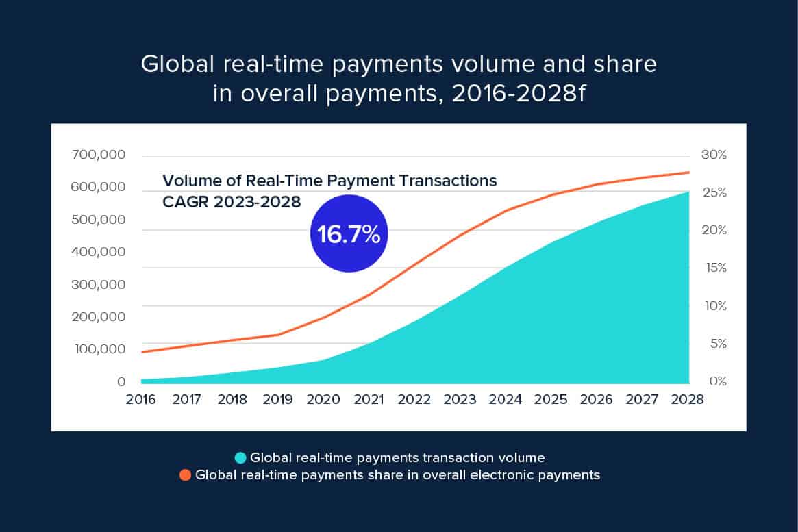 In every corner of the world, real-time payments are now in regular use — moving value at scale and at low cost. In 2023, just under one-fifth of all electronic payments globally were real-time, and by 2028, it will be more than one-quarter.