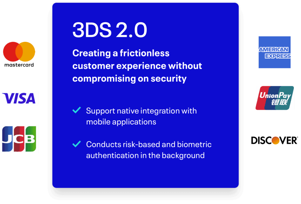 In 2018, EMVCo — a consortium between Visa, American Express, Mastercard, China UnionPay, Discover and JCB — introduced 3D Secure 2.0 (3DS 2.0). Compared to the original 3DS, 3DS 2.0 includes a software development toolkit to support native integration with mobile applications and conducts risk-based and biometric authentication in the background, creating a frictionless customer experience without compromising on security.
