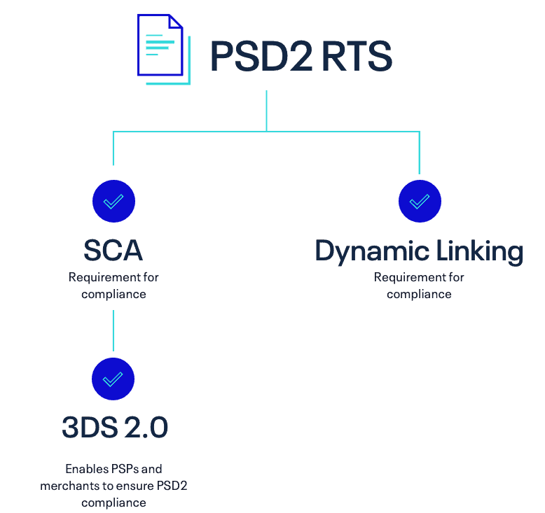 Both SCA and dynamic linking are requirements for compliance under PSD2’s RTS, while 3DS 2.0 is a form of SCA that enables PSPs and merchants to ensure PSD2 compliance.